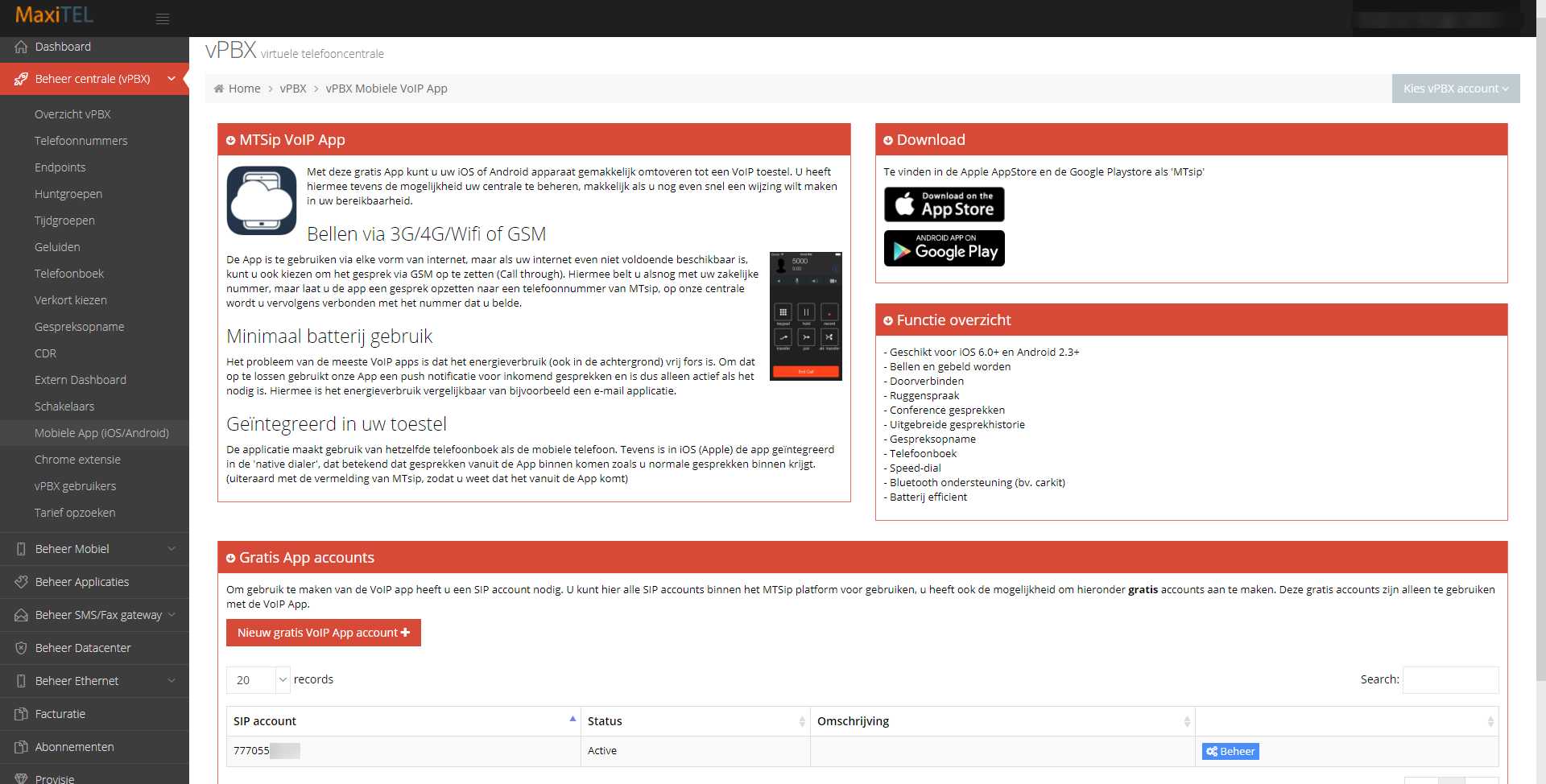 Voor het gebruik van de App is een VoIP account nodig. Deze kunt u gratis aanmaken bij ons in de portal: https://portal.maxitel.nl/ Wanneer ingelogd, gaat u naar "Beheer Centrale", en vervolgens naar "Mobiele App"